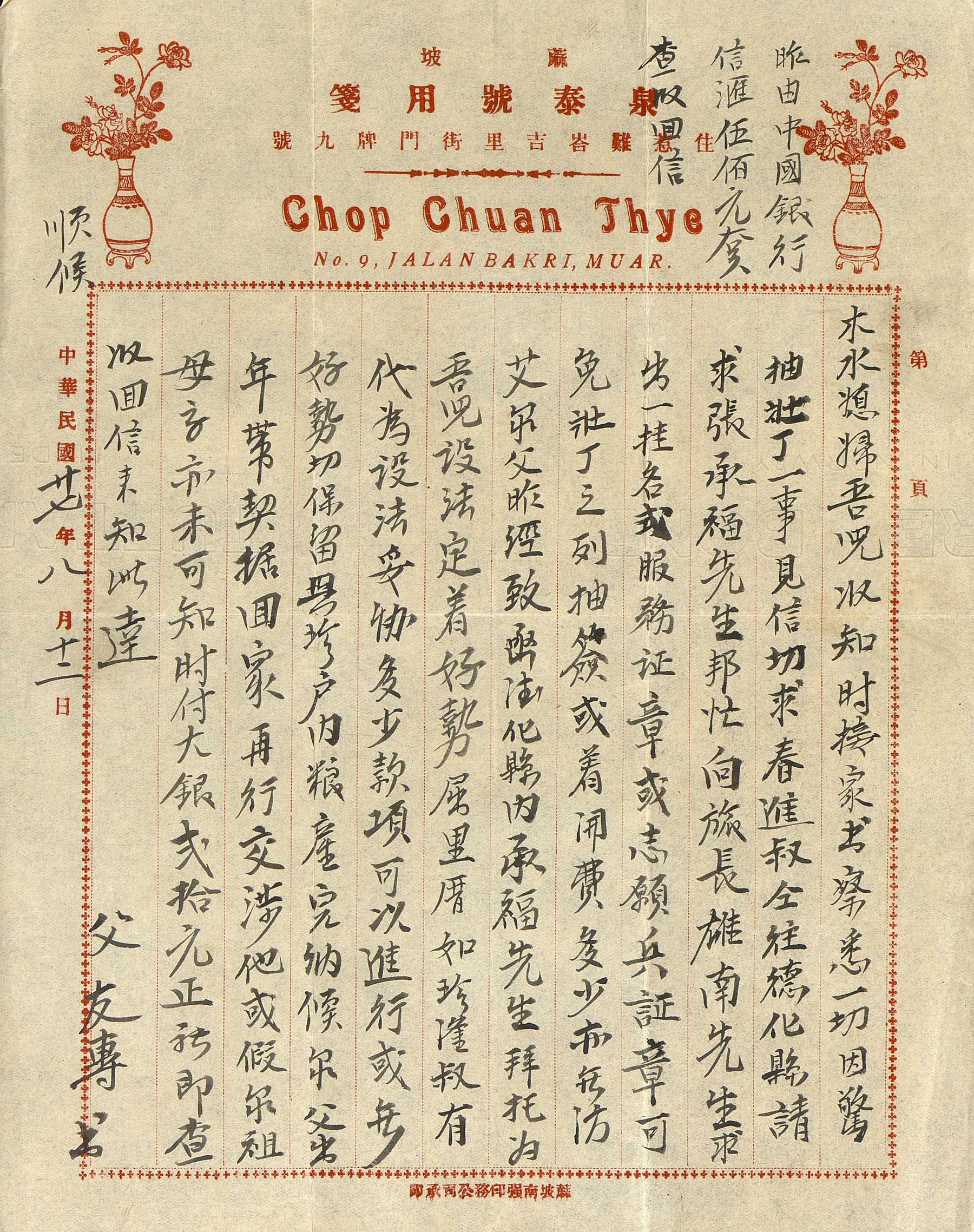 厦门为著名港口城市,绝大多数福建民众出国、返乡都经由此地中转,故厦门拥有的侨批局数量最多(曾占全省80%)。厦门最早的侨批局即是由永春石鼓镇卿园村的黄日兴于1877年所开设的民信局。6李家耀迁居厦门之前,已经有不少永春人移居厦门,厦门永春会馆已经存在。