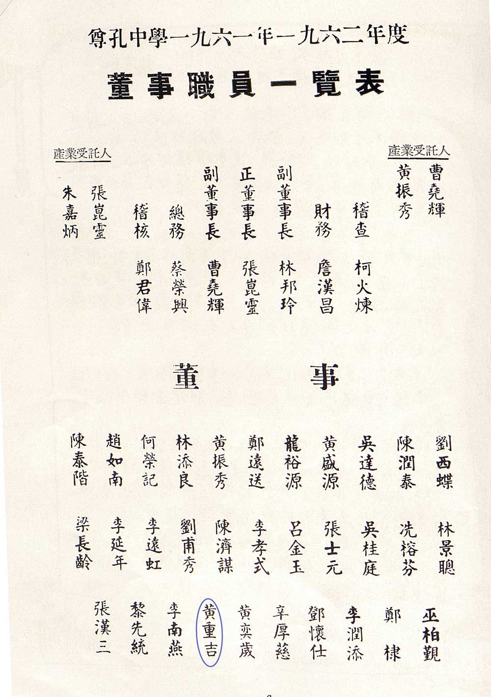 黄重吉於1961年-1962年擔任尊孔中學董事一職